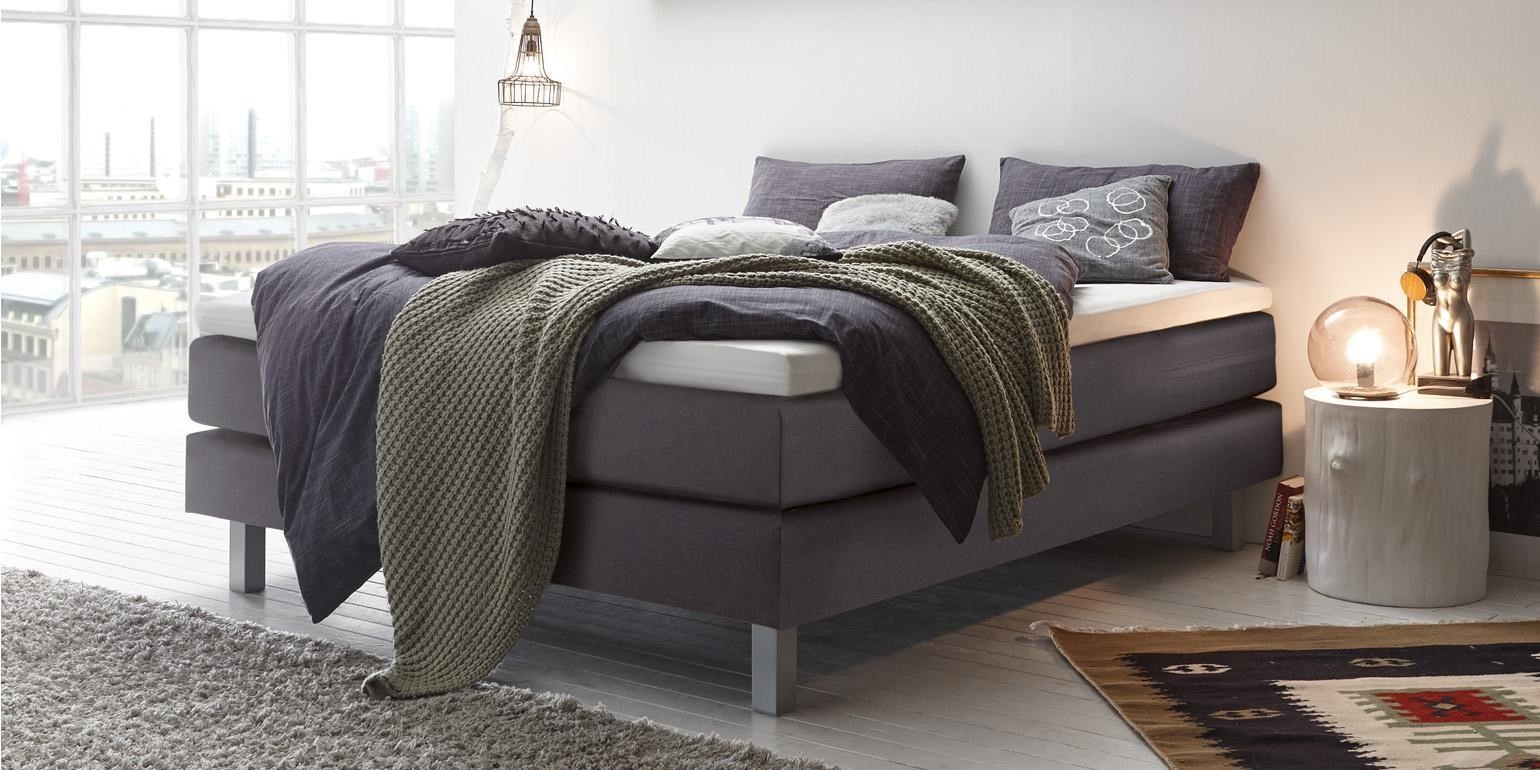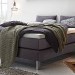 Lit Boxspring complet2 sommiers hauteur 18cm1 matelas medium-ferme hauteur 20cm1 surmatelas Base hauteur 6cmRevêtement à choix 3 couleurs tissu Pepe ou cuir synthétique Kull.