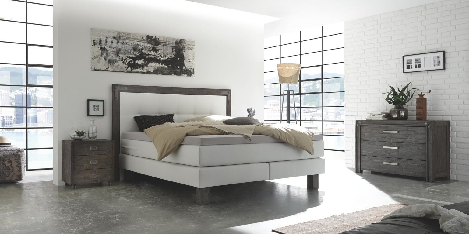 Lit Boxspring complet avec cadre en acaccia vintage brun ou gris.Tête de lit rembourrée 2 sommiers hauteur 18cm1 matelas medium-ferme hauteur 20cm1 surmatelas Base hauteur 6cmRevêtement à choix tissu Pepe ou cuir synthétique Kull.