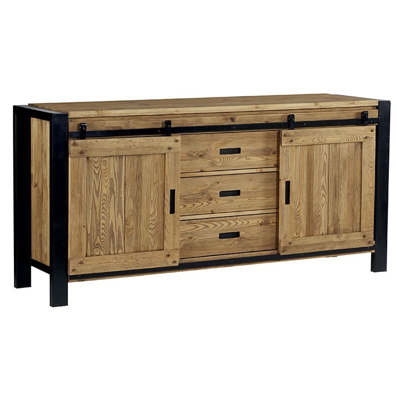 Bahut 2 portes coulissantes et 3 tiroirs, armature métal noir et corps en Pin massif brossé finition lasurée.Largeur:190cm profondeur: 50 cm Hauteur:90cm