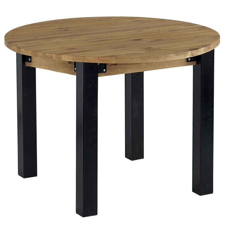 Table de salle à manger avec 1 allonge centrale de 50cm diamètre 110cm armature métal noir et corps en pin massif brossé et lasuré .