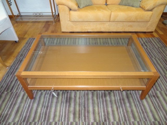 Table basse avec tiroir en h^rtre teinté cerisier et verre